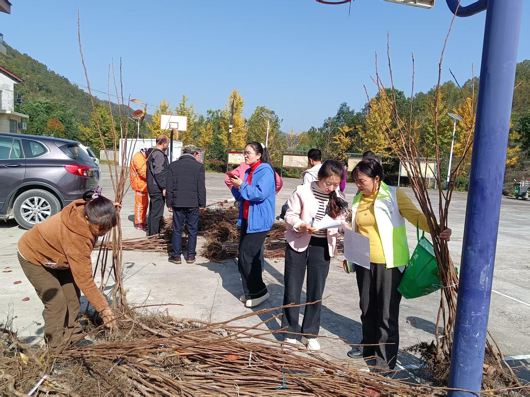 组织农户到村领取甜柿子树苗,助力发展庭院经济